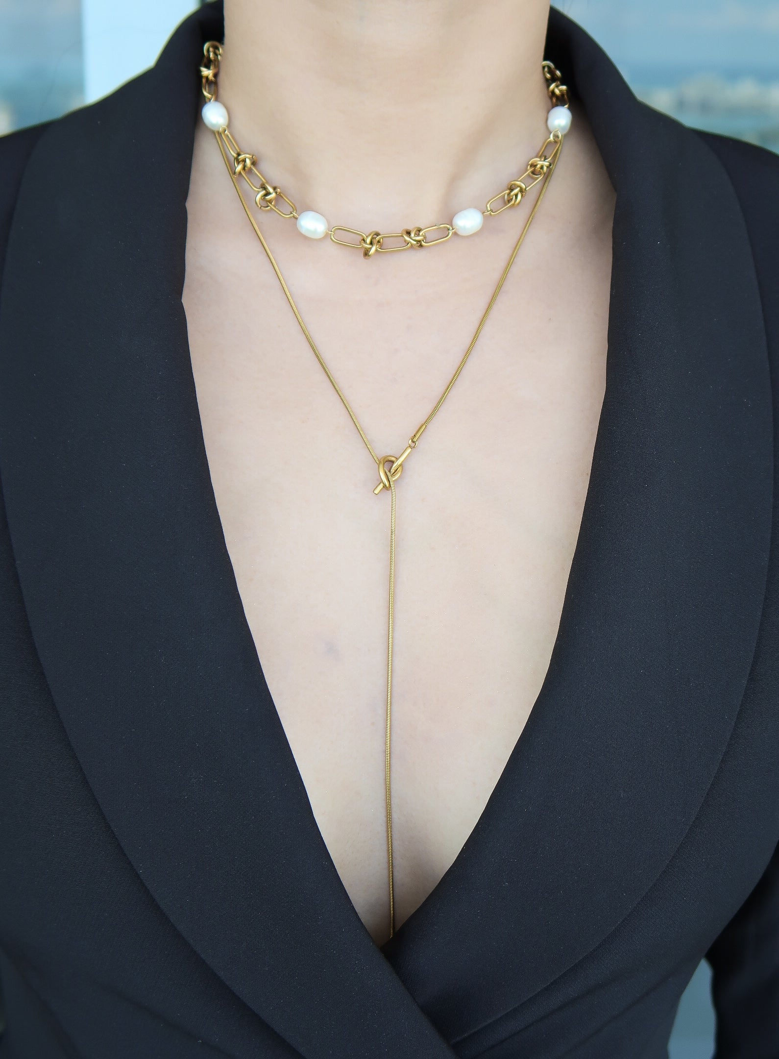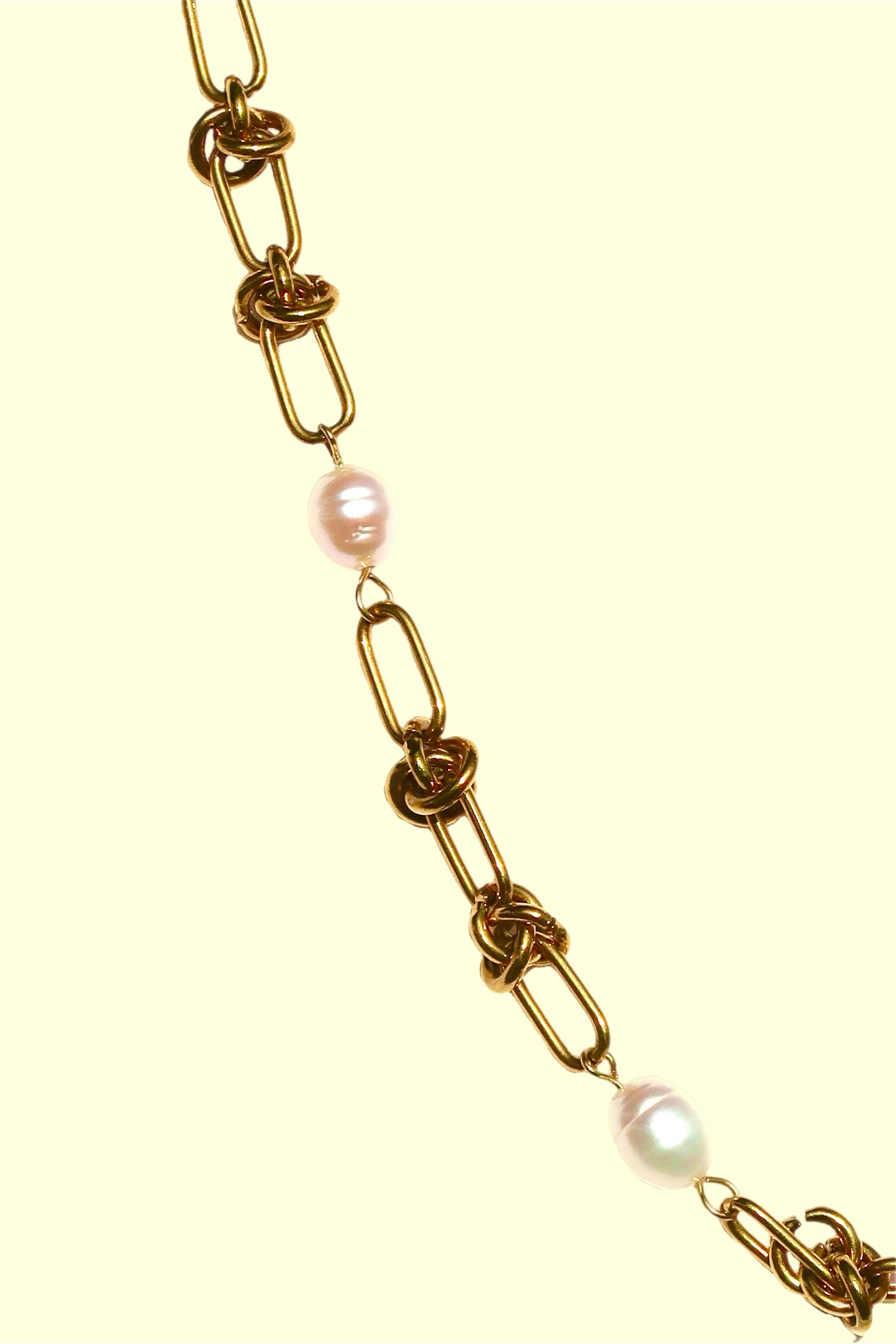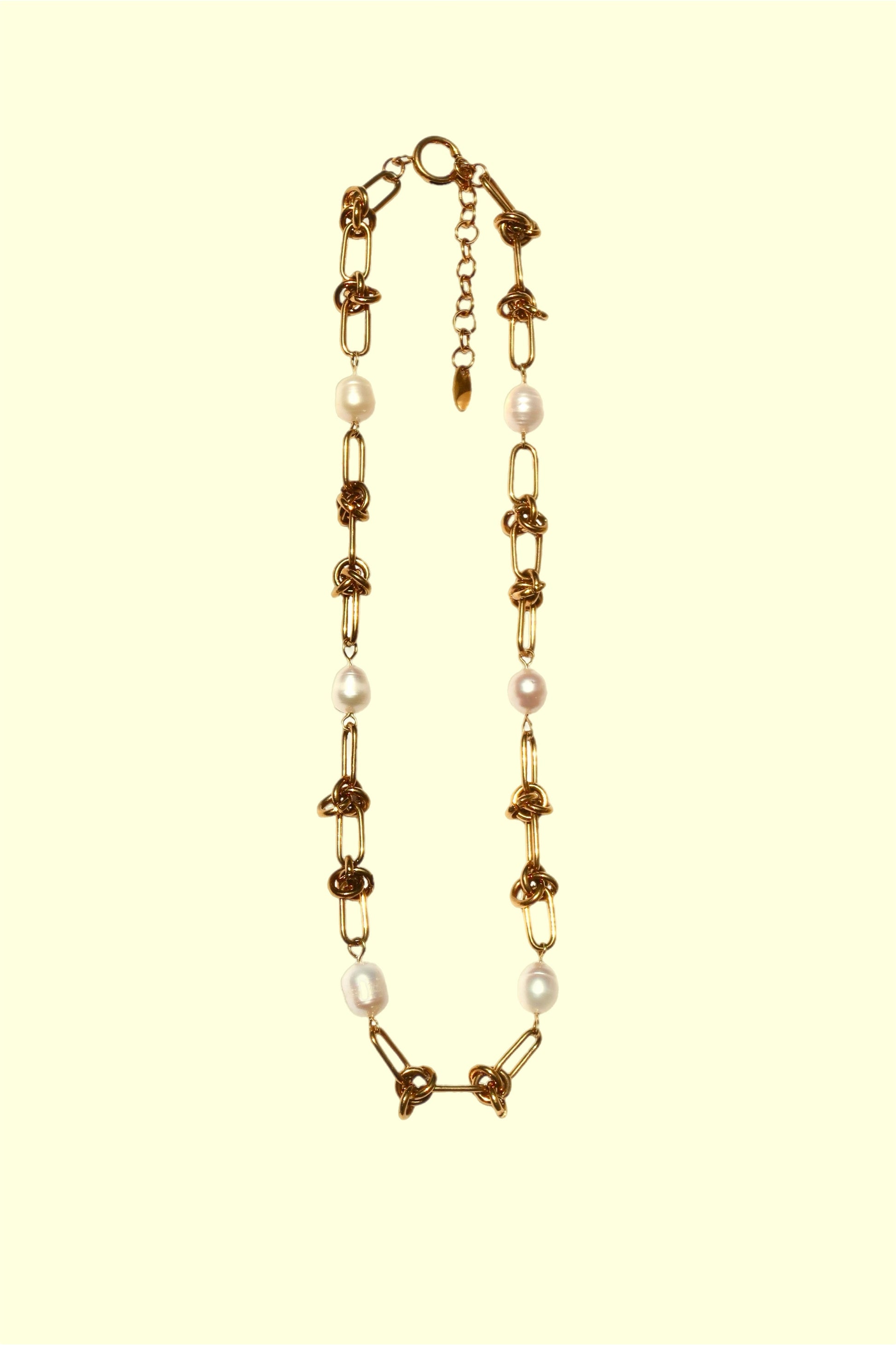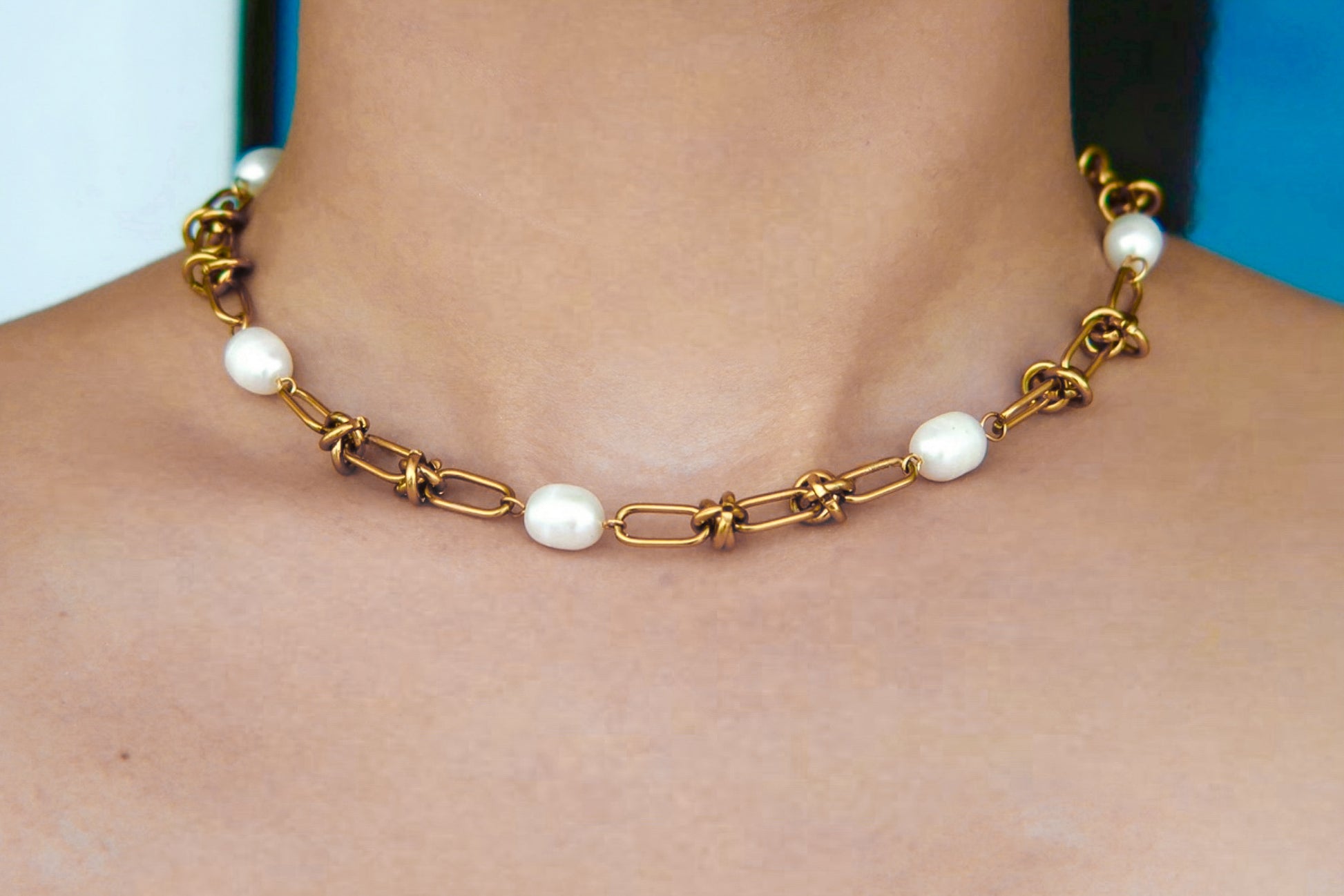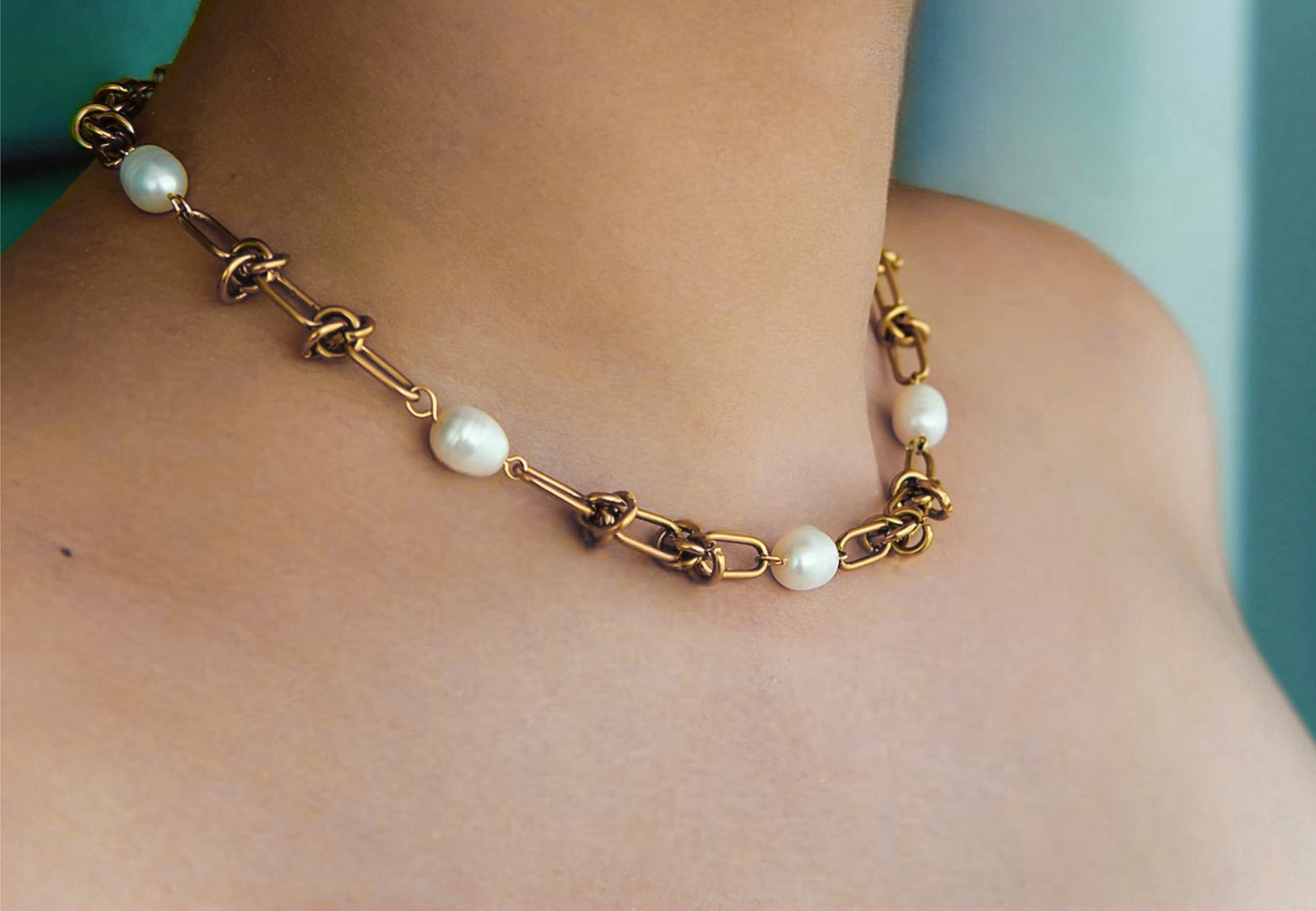 Radiate confidence with the Soleil Necklace. Featuring luminous pearls interwoven with bold, knotted gold chain links, this design strikes the perfect balance between classic sophistication and modern edge. Ideal for any occasion, the Soleil Necklace adds a captivating touch to both casual and formal looks. Make it the centerpiece of your collection and shine effortlessly.