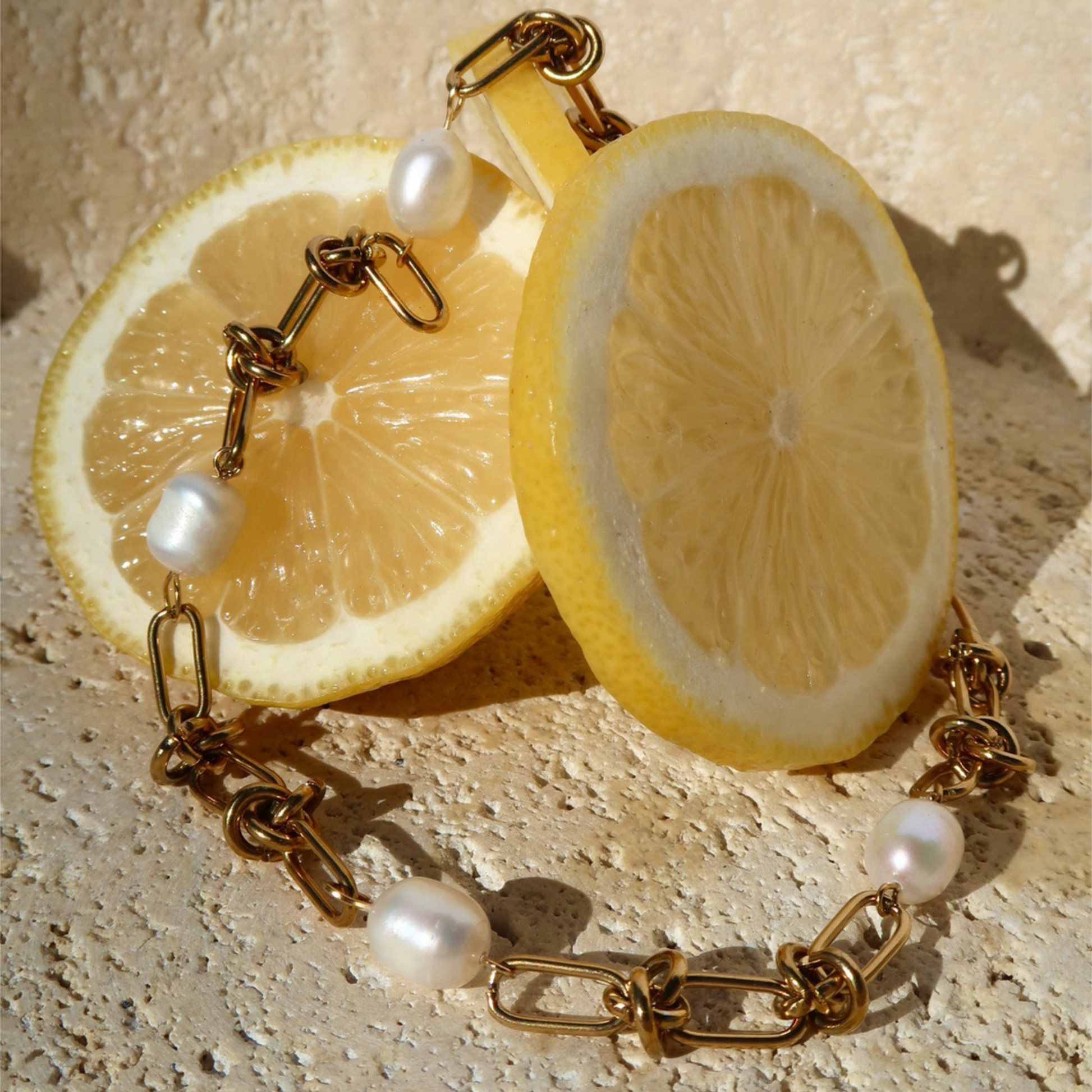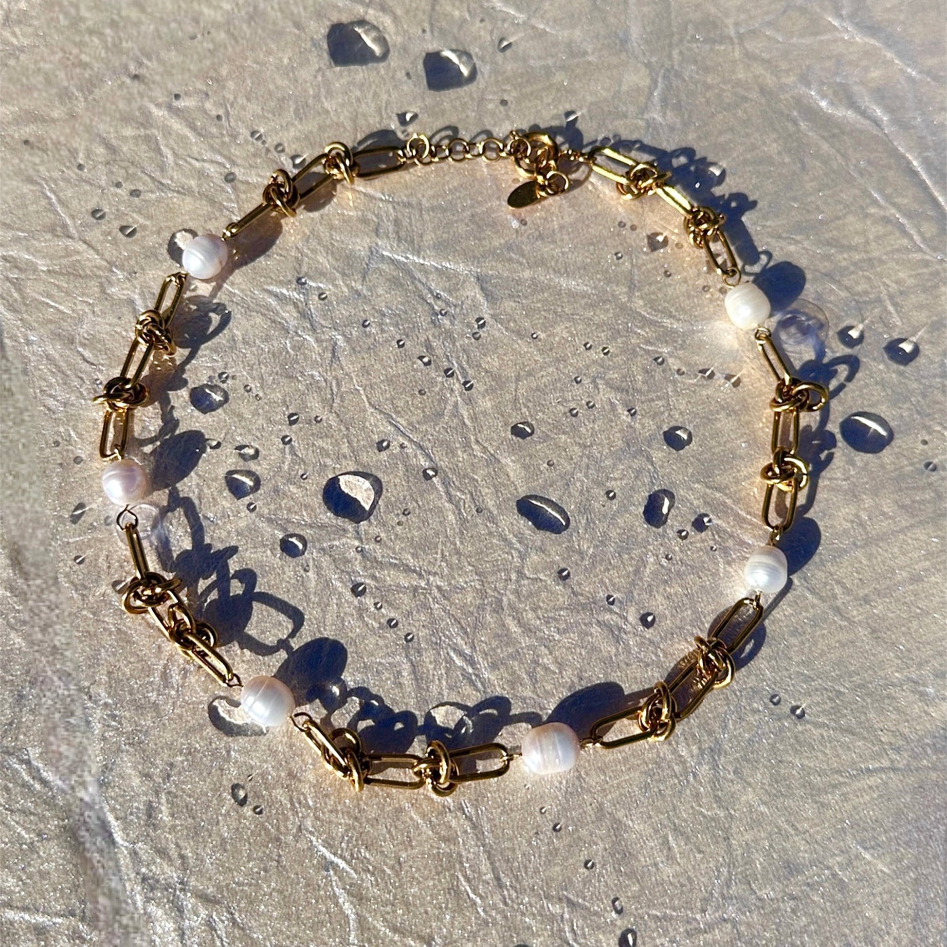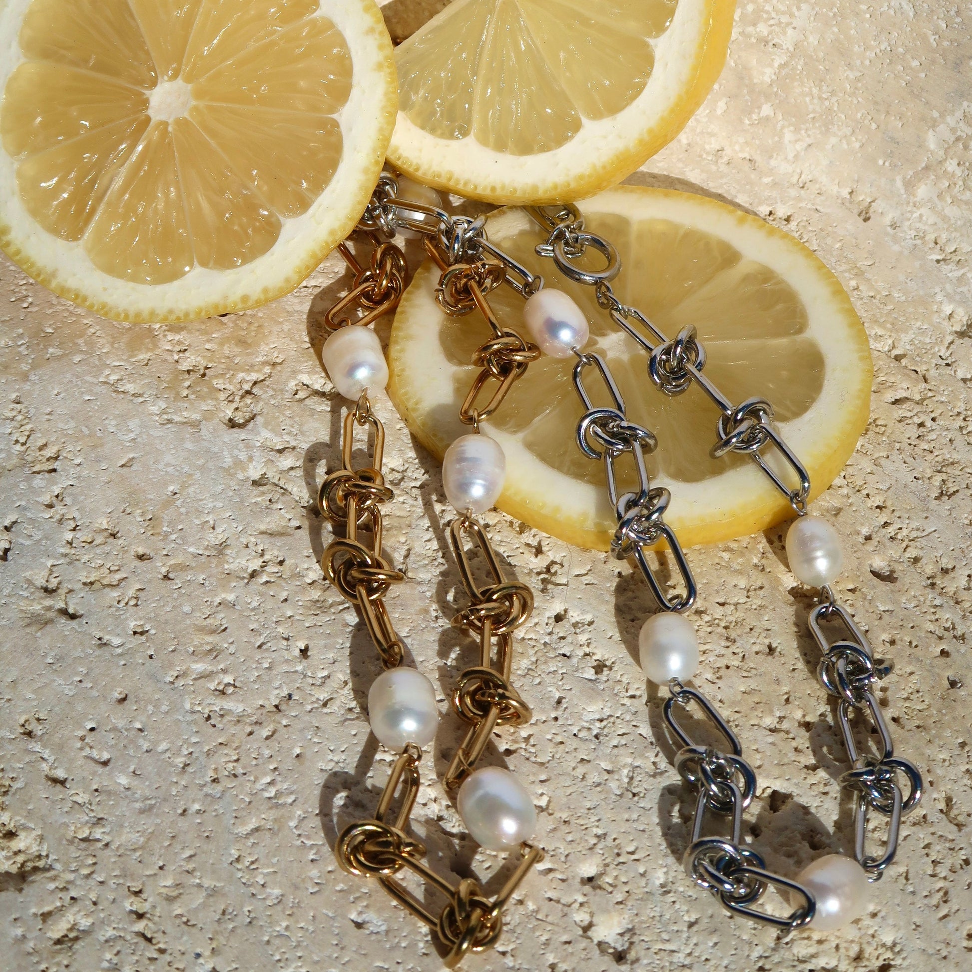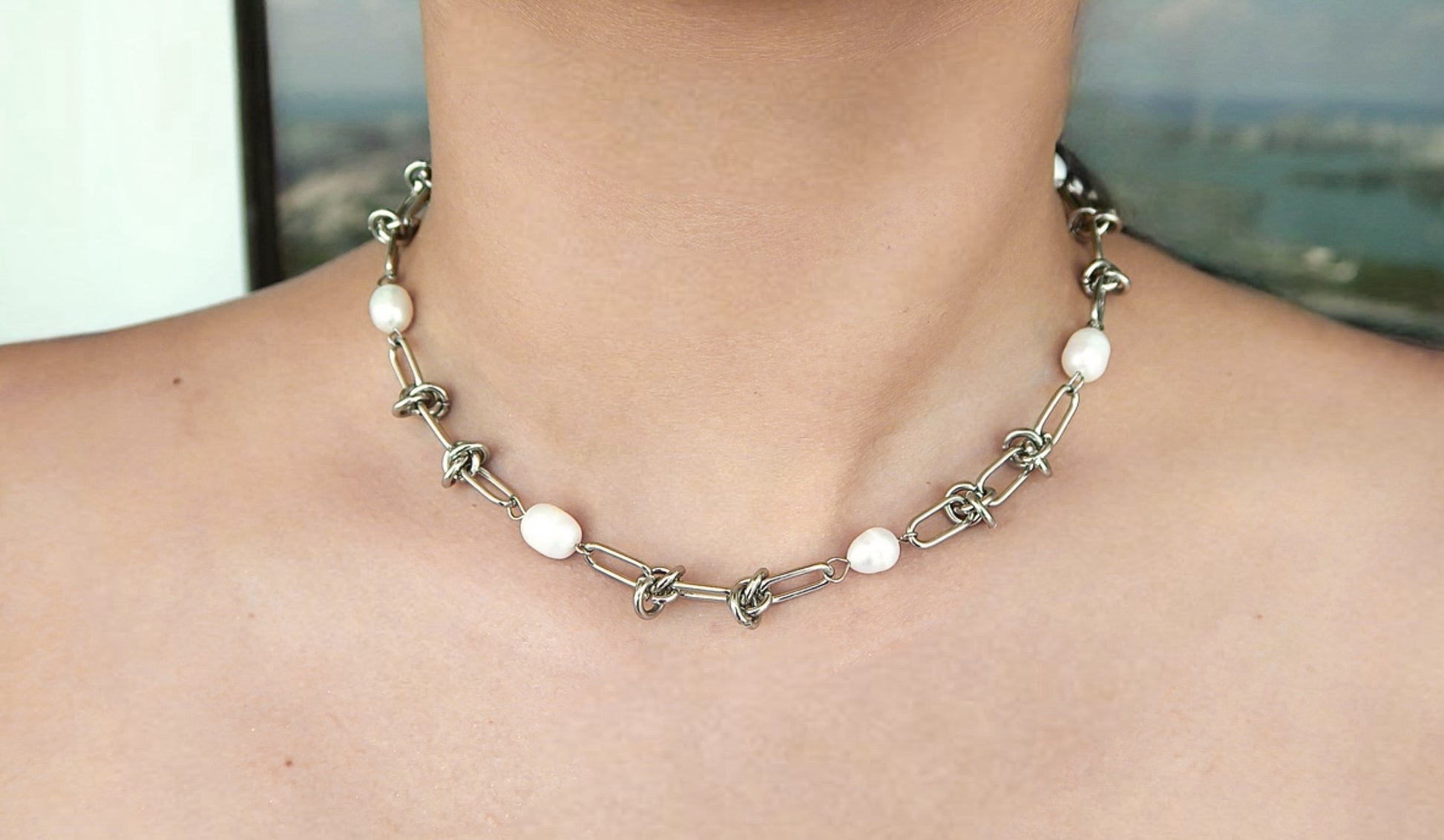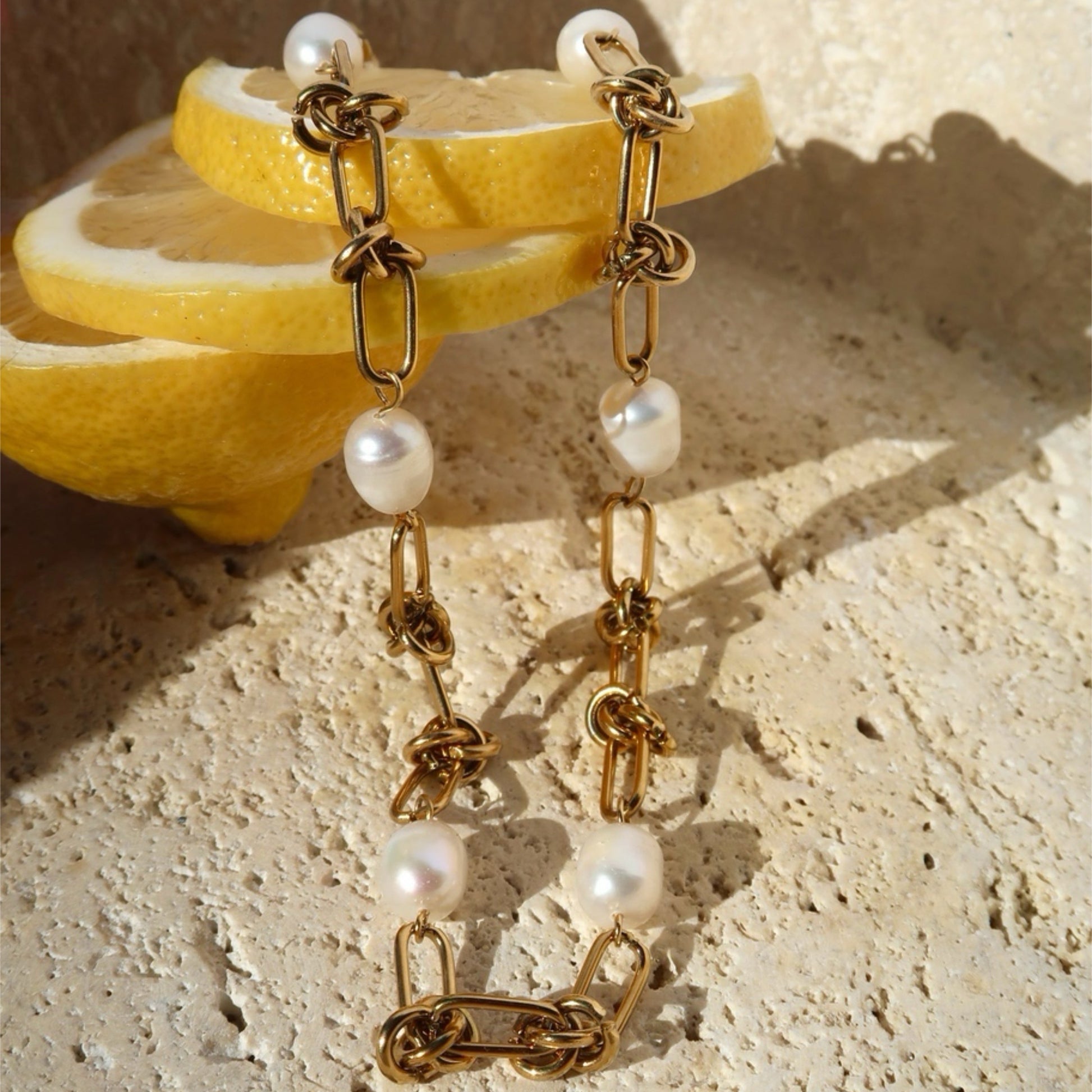 Radiate confidence with the Soleil Necklace. Featuring luminous pearls interwoven with bold, knotted gold chain links, this design strikes the perfect balance between classic sophistication and modern edge. Ideal for any occasion, the Soleil Necklace adds a captivating touch to both casual and formal looks. Make it the centerpiece of your collection and shine effortlessly.